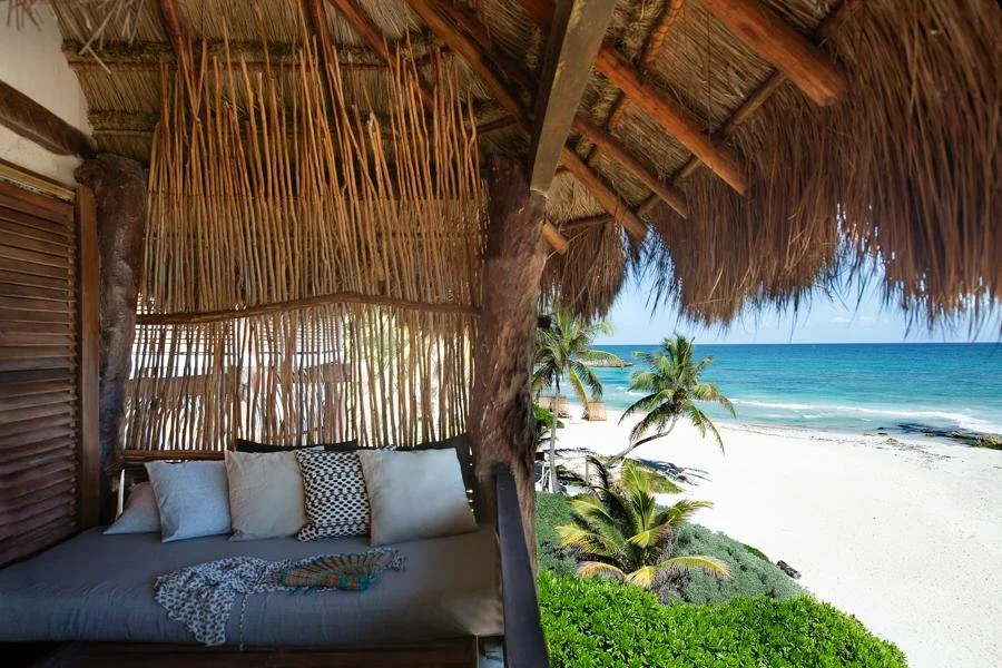 A modern bright room with a king bed facing the garden with a minimalistic Tulum style.